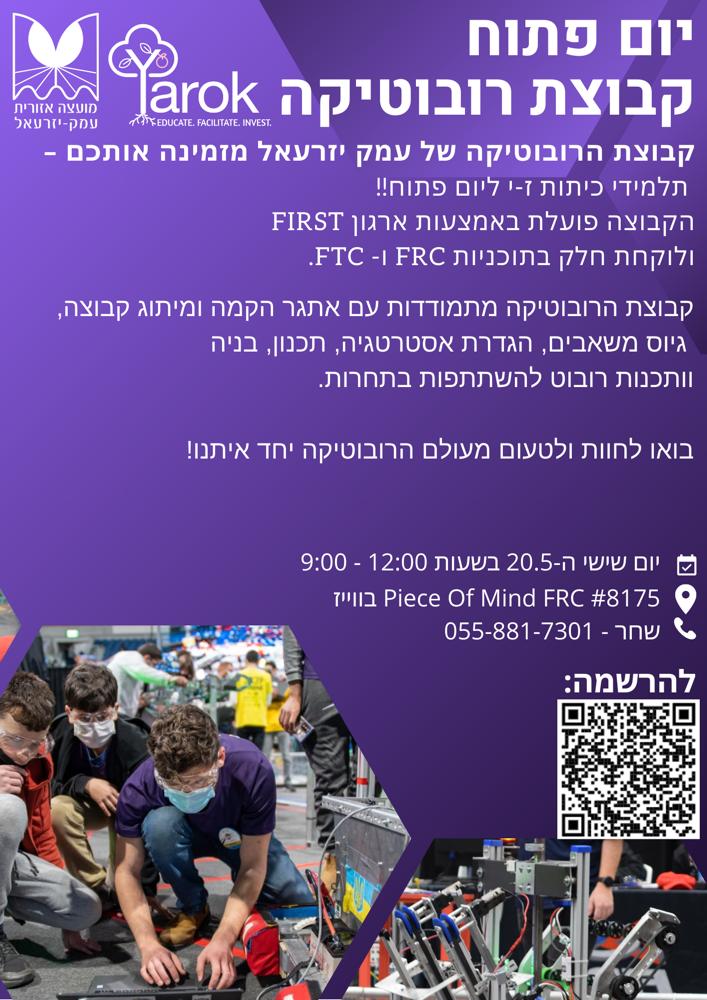 2. יום פתוח בקבוצת הרובוטיקה - קבוצת הרובוטיקה Piece of Mind מזמינה אתכם ליום פתוח! בואו לחוות ולהתנסות איתנו בתחומי הרובוטיקה! אין צורך בידע מוקדם. הרשמה בלינק>>> https://forms.gle/BvLjX6u89xSpWr2i9 לשאלות נוספות: שחר 0558817301