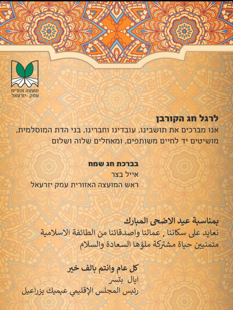 לרגל חג הקרבן, אנו מברכים את תושבינו, עובדינו וחברינו בני הדת המוסלמית . אנו מושיטים יד לחיים משותפים ומאחלים שלוה ושלום. מצורפת ברכת ראש המועצה .  |