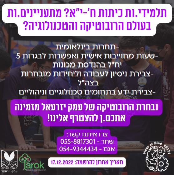 2. ירוק בעמק- הרשמה להצטרף לנבחרת הרובוטיקה של הנוער - https://forms.gle/c8dvwG4BGinrUned6 - מצורף פלייר הסבר